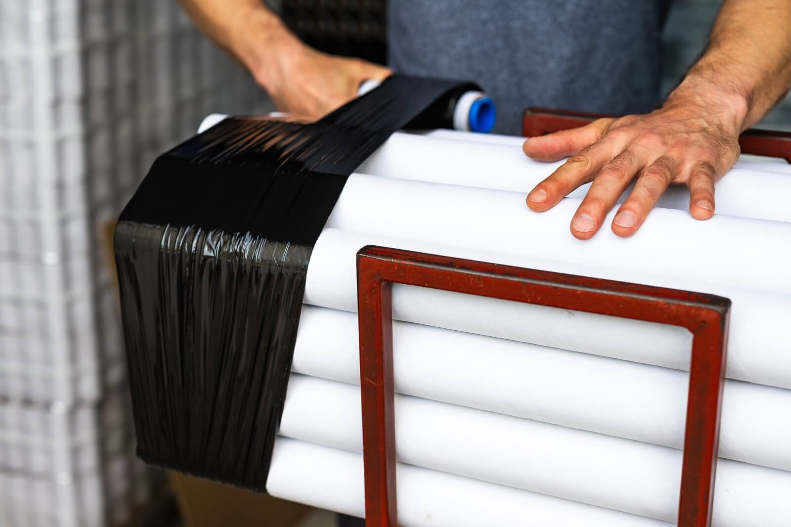 Folię mini stretch oferujemy w kolorze czarnym. *Wymiary mini stretch: - waga 250 g, - szerokość foli na tulejce 10 cm, - długość tulejki 14 cm, ø38 mm, Mini stretch czarny jest pakowny w opakowania kartonowe po 24 lub 48 sztuk.